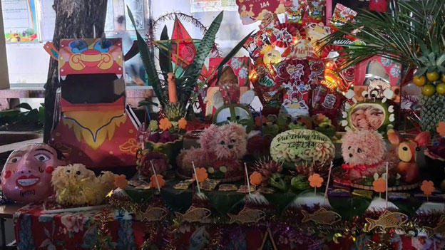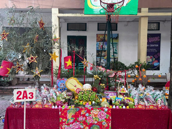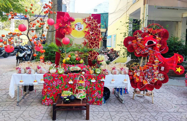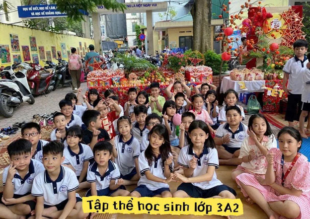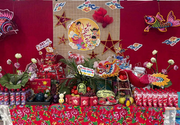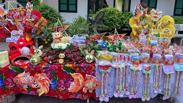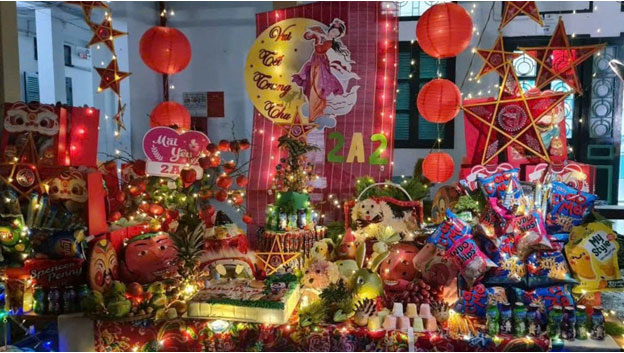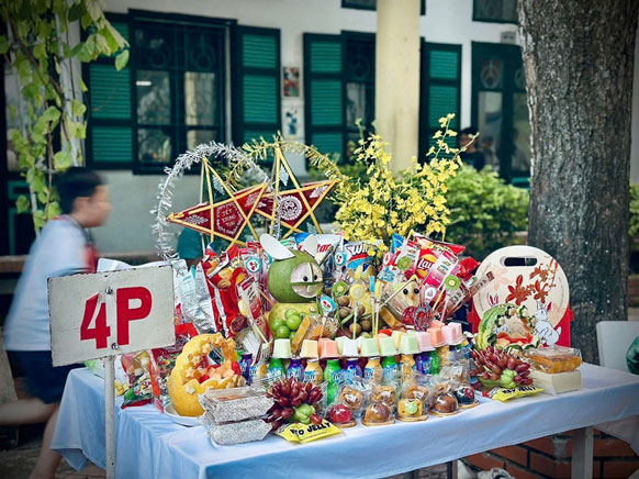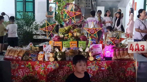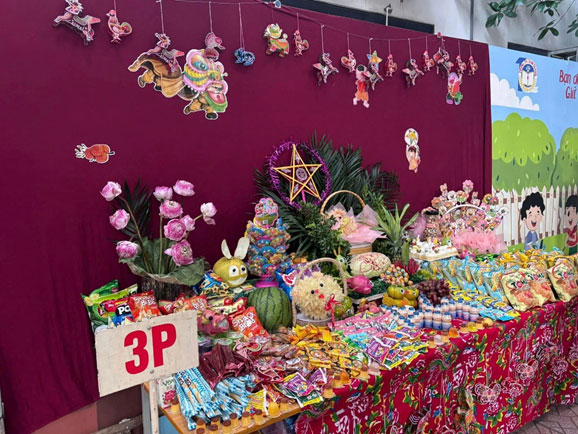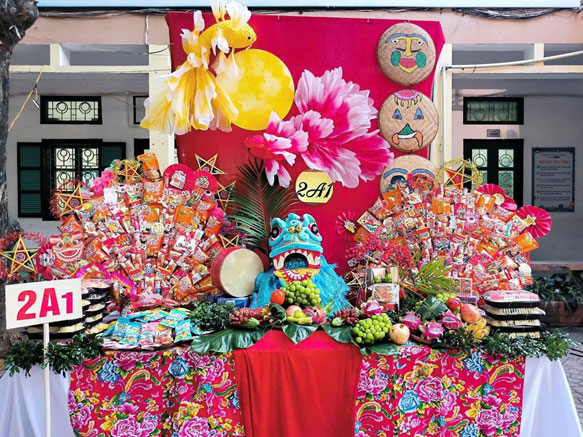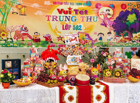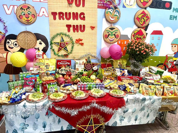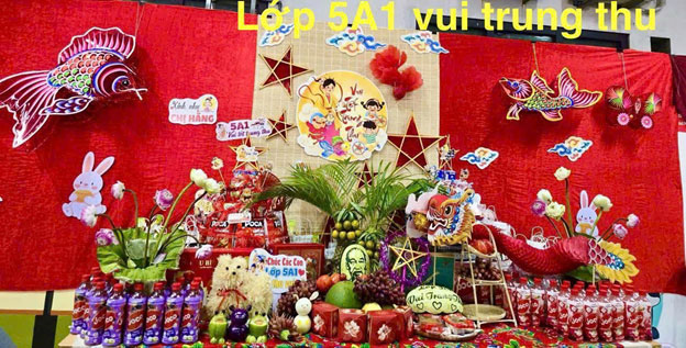 Ngay từ khâu chuẩn bị, các lớp đã hào hứng bày trí mâm cỗ Trung thu lớp mình ở sân trường. Mỗi mâm cỗ đẹp một vẻ nhưng có điểm chung là mâm nào cũng đầy đặn và là sự tổng hòa của những món các em thích nhất.