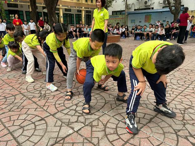 Các em học sinh khối 1 với trò chơi Chuyền bóng