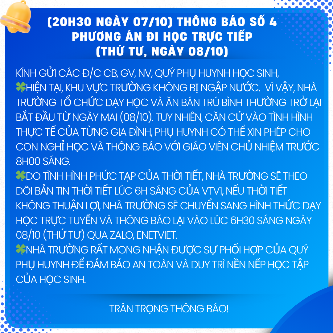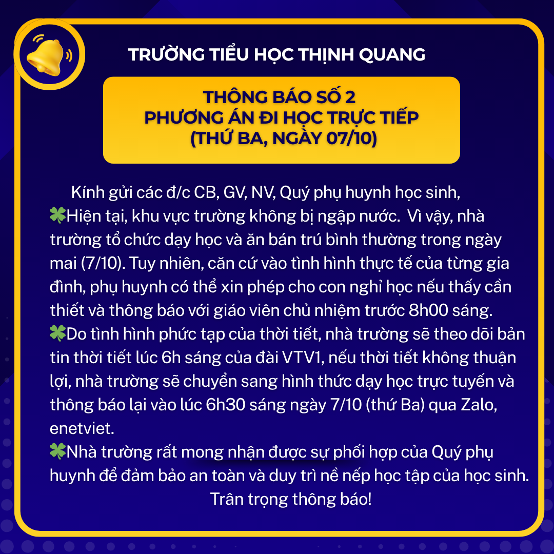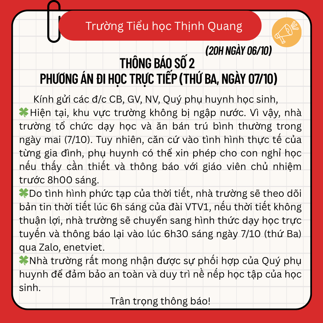 Thông báo số 2: phương án đi học trực tiếp (thứ Ba, ngày 7/10/2025)