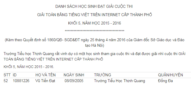 Danh sách học sinh đạt giải trong các cuộc thi giao lưu quốc tế, quốc gia, thành phố, quận năm học 2024-2025