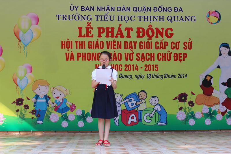 Một bạn học sinh thay mặt hơn một nghìn học sinh toàn trường đọc diễn văn hưởng ứng cuộc thi