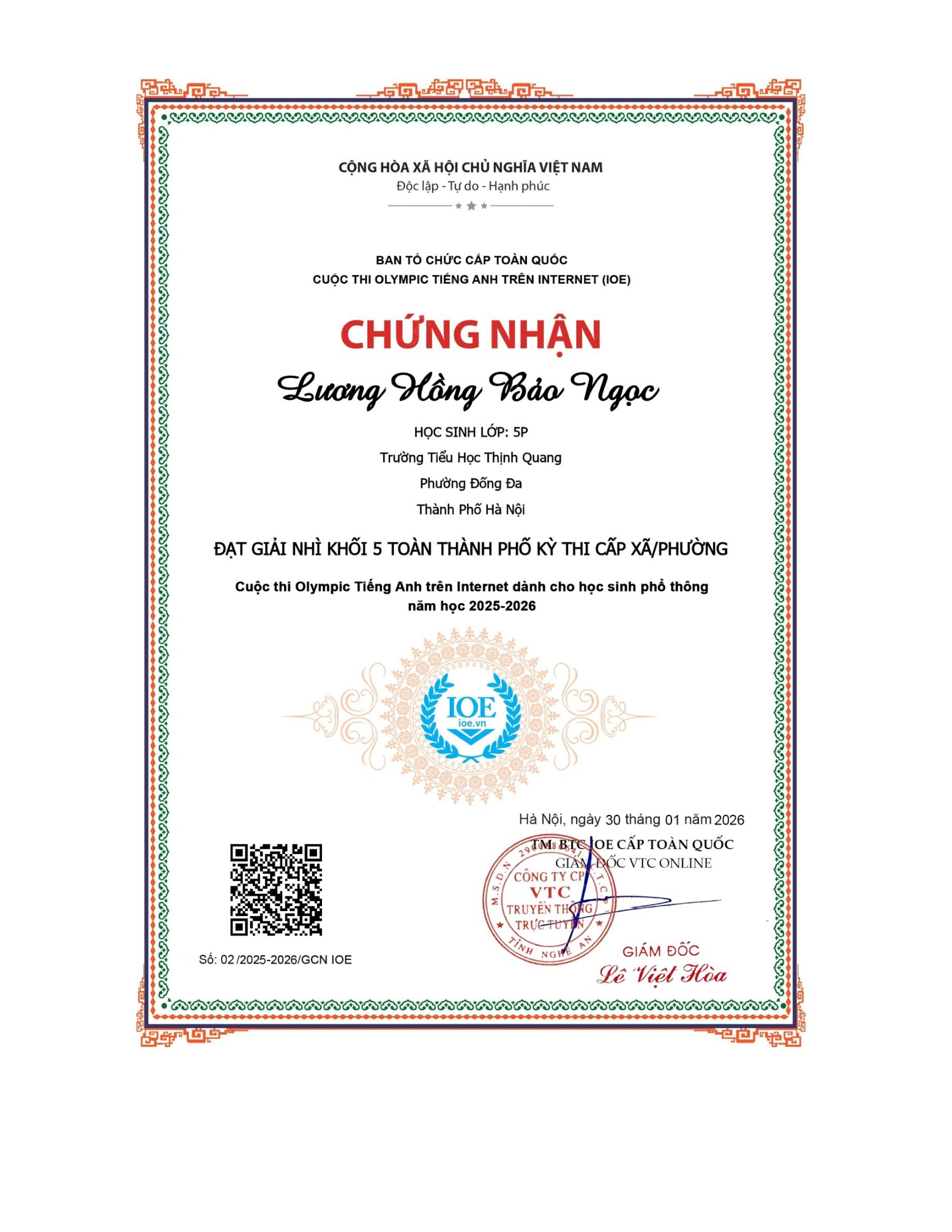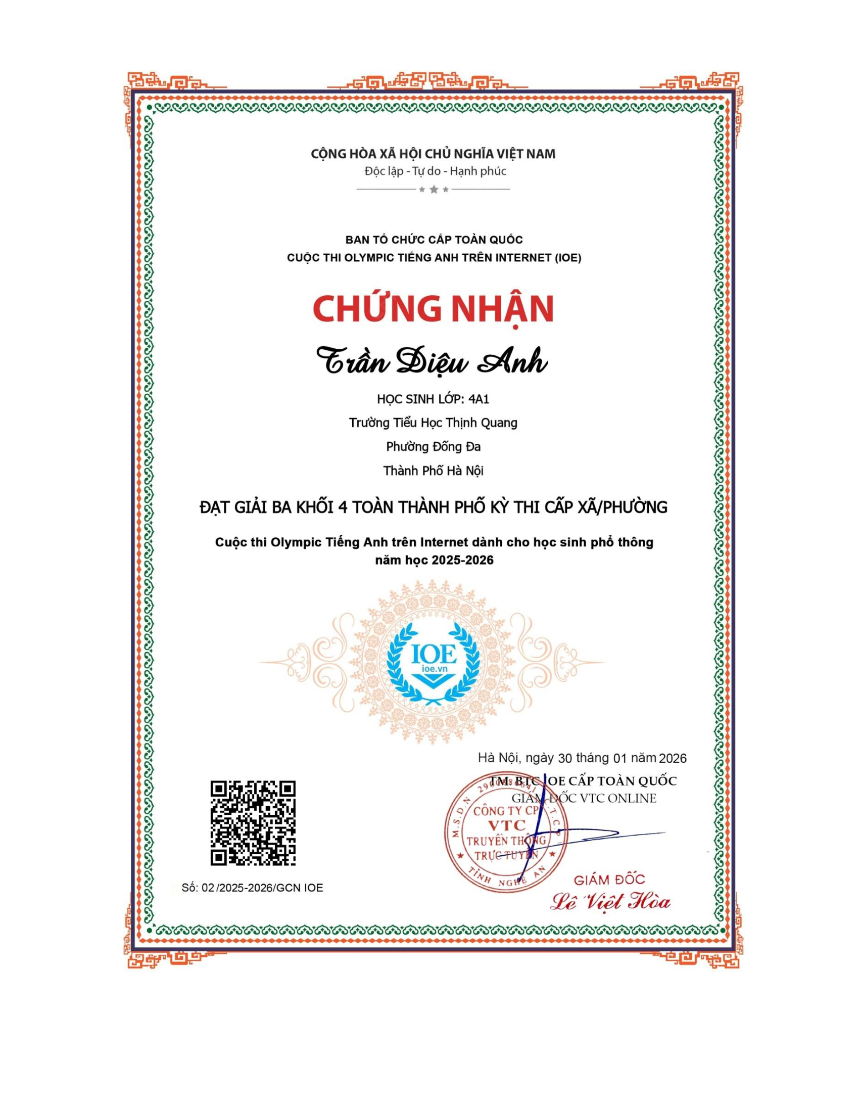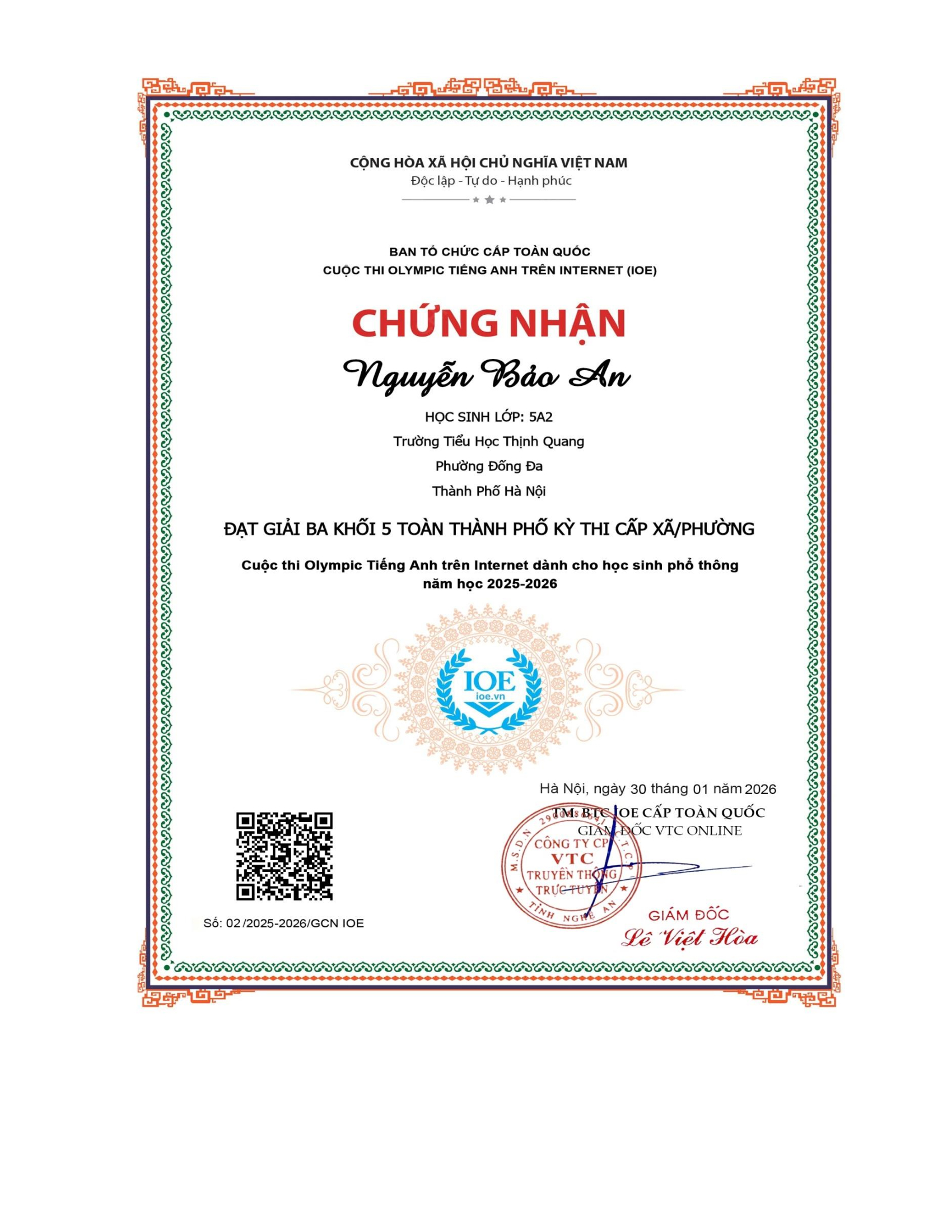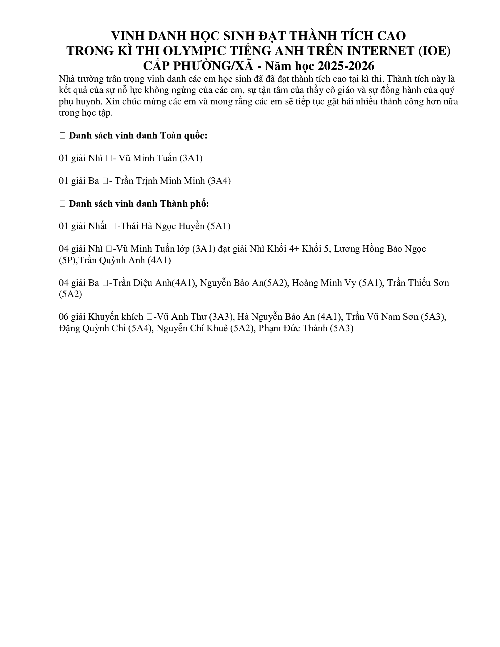 Vinh danh học sinh đạt thành tích cao trong kì thi Olympic tiếng Anh trên internet (IOE) cấp Phường/Xã - Năm học 2025-2026