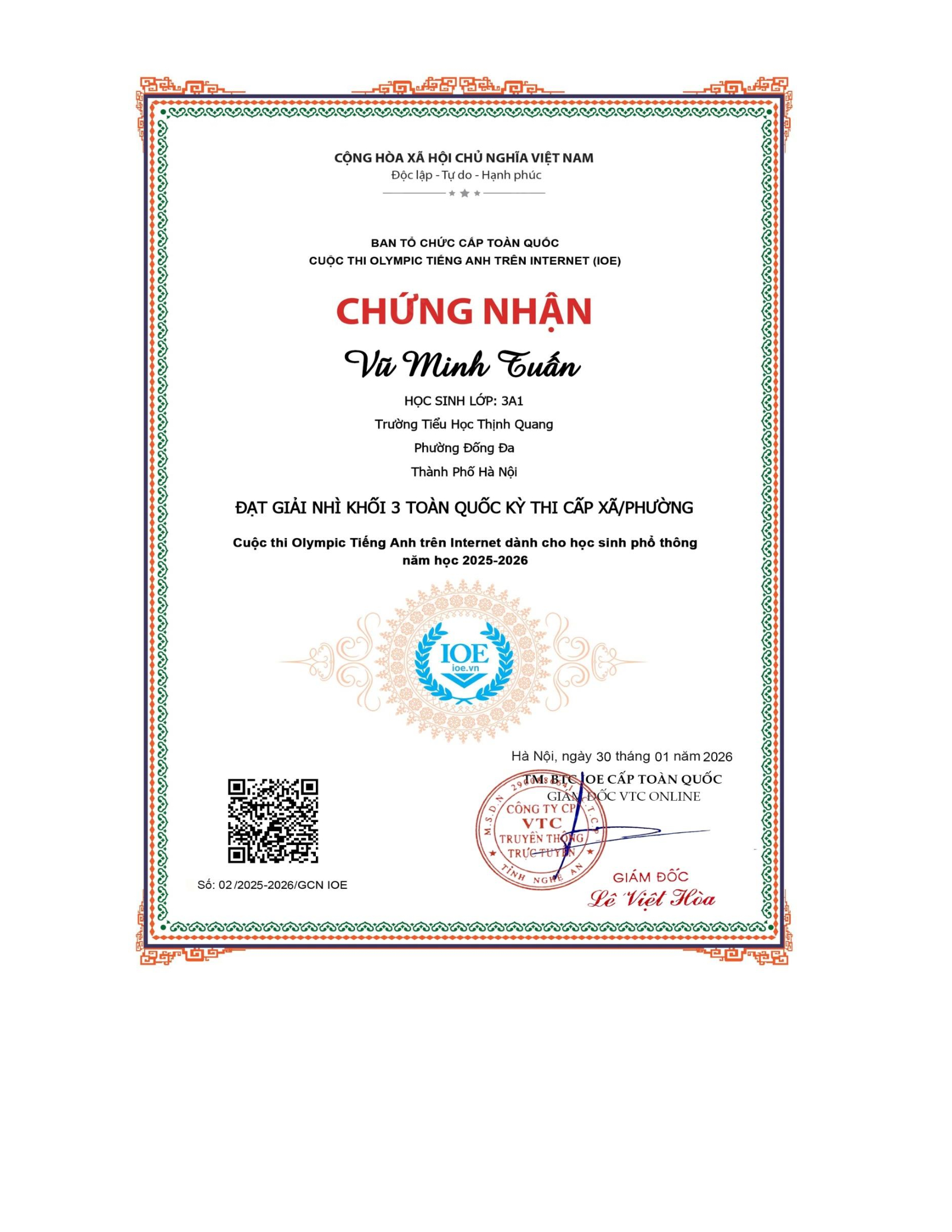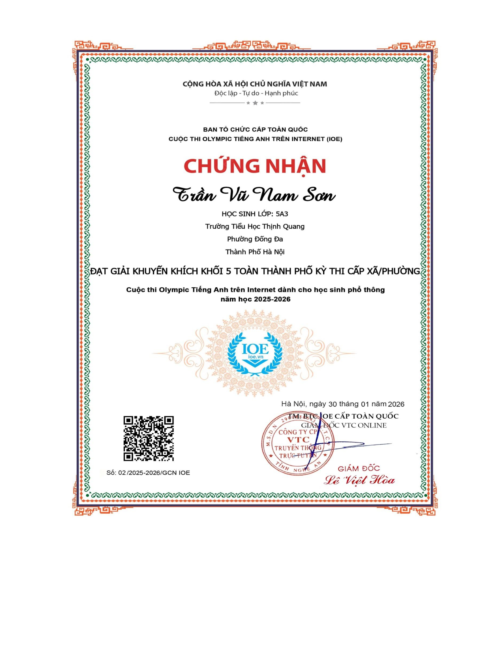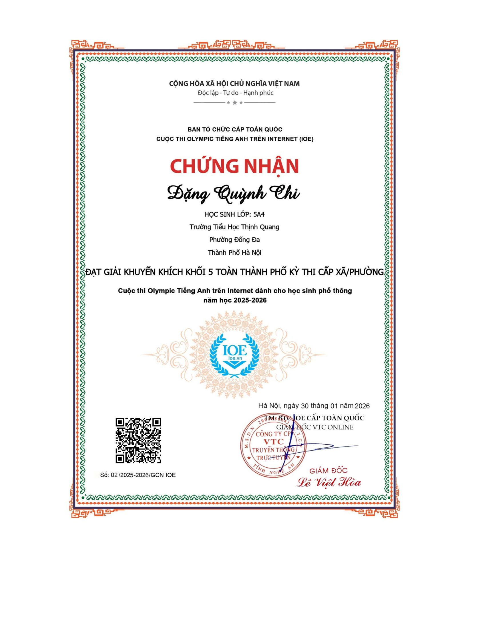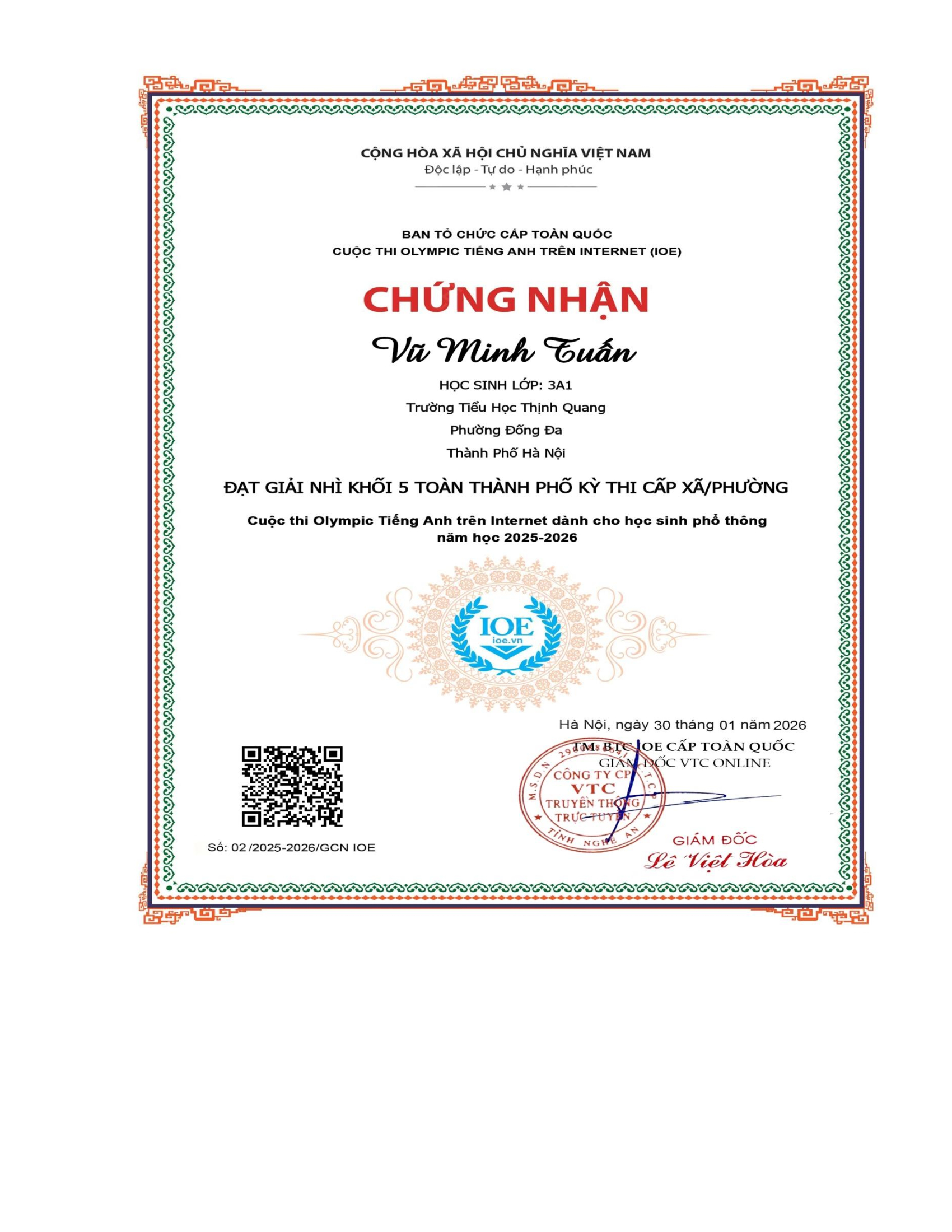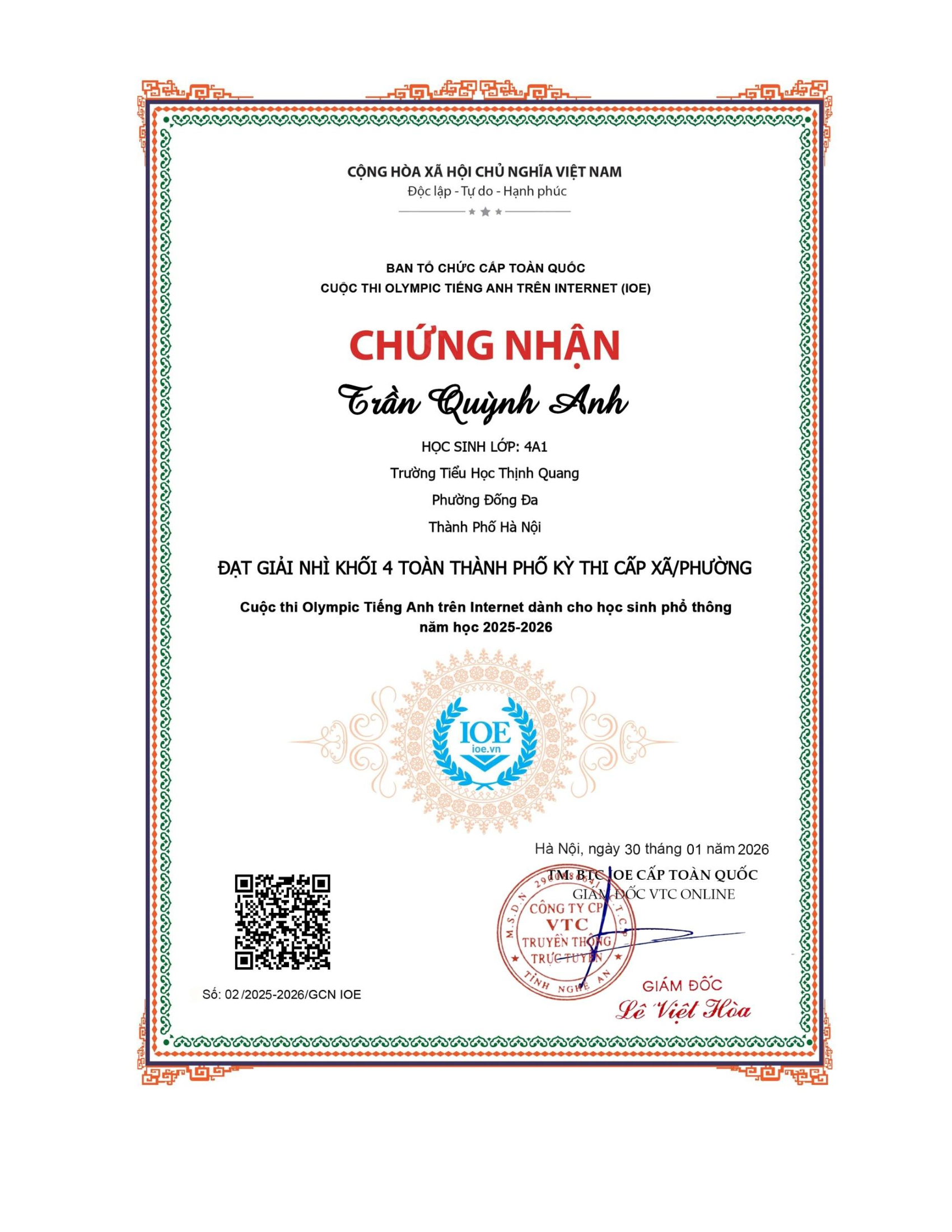 Vinh danh học sinh đạt thành tích cao trong kì thi Olympic tiếng Anh trên internet (IOE) cấp Phường/Xã - Năm học 2025-2026