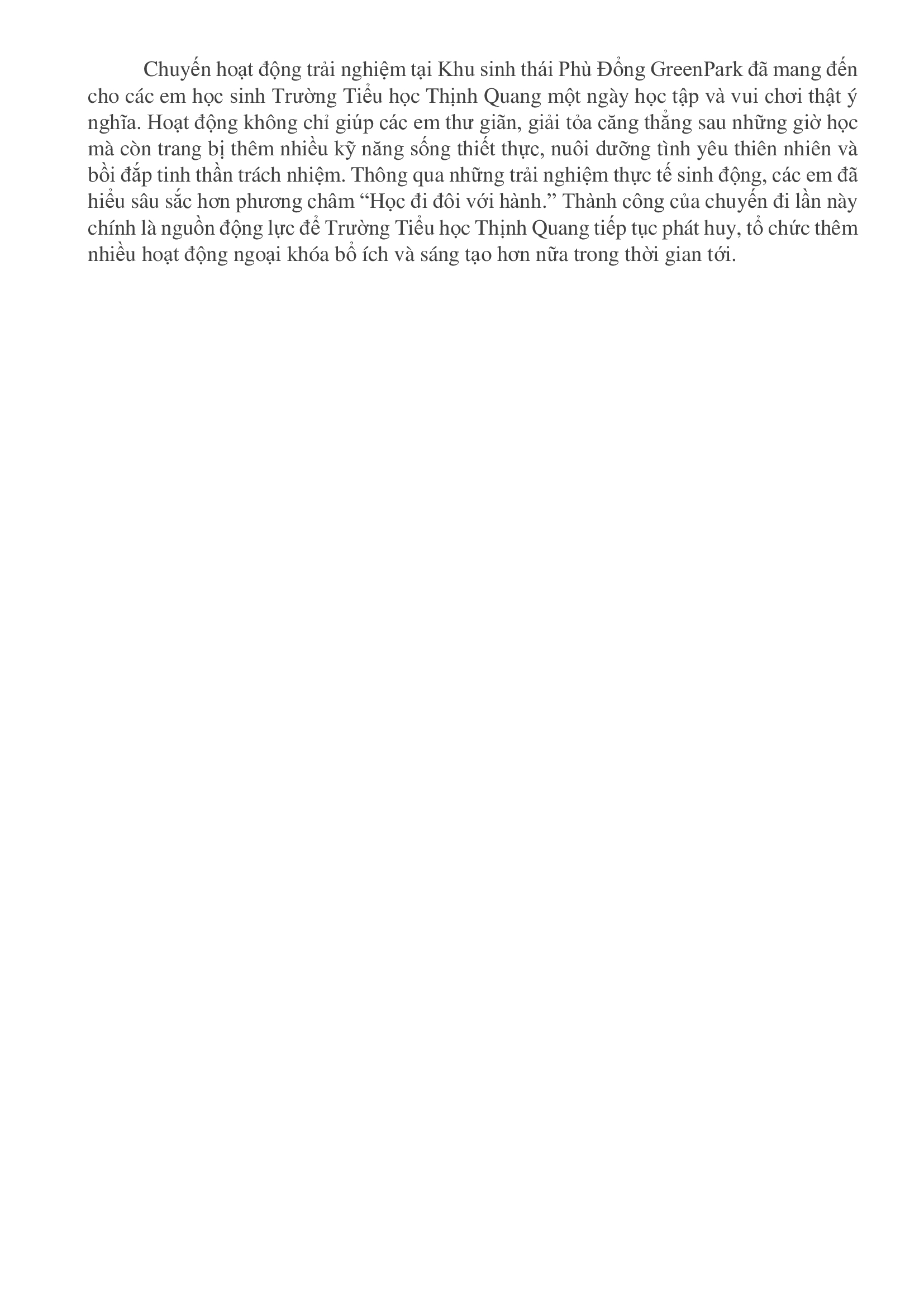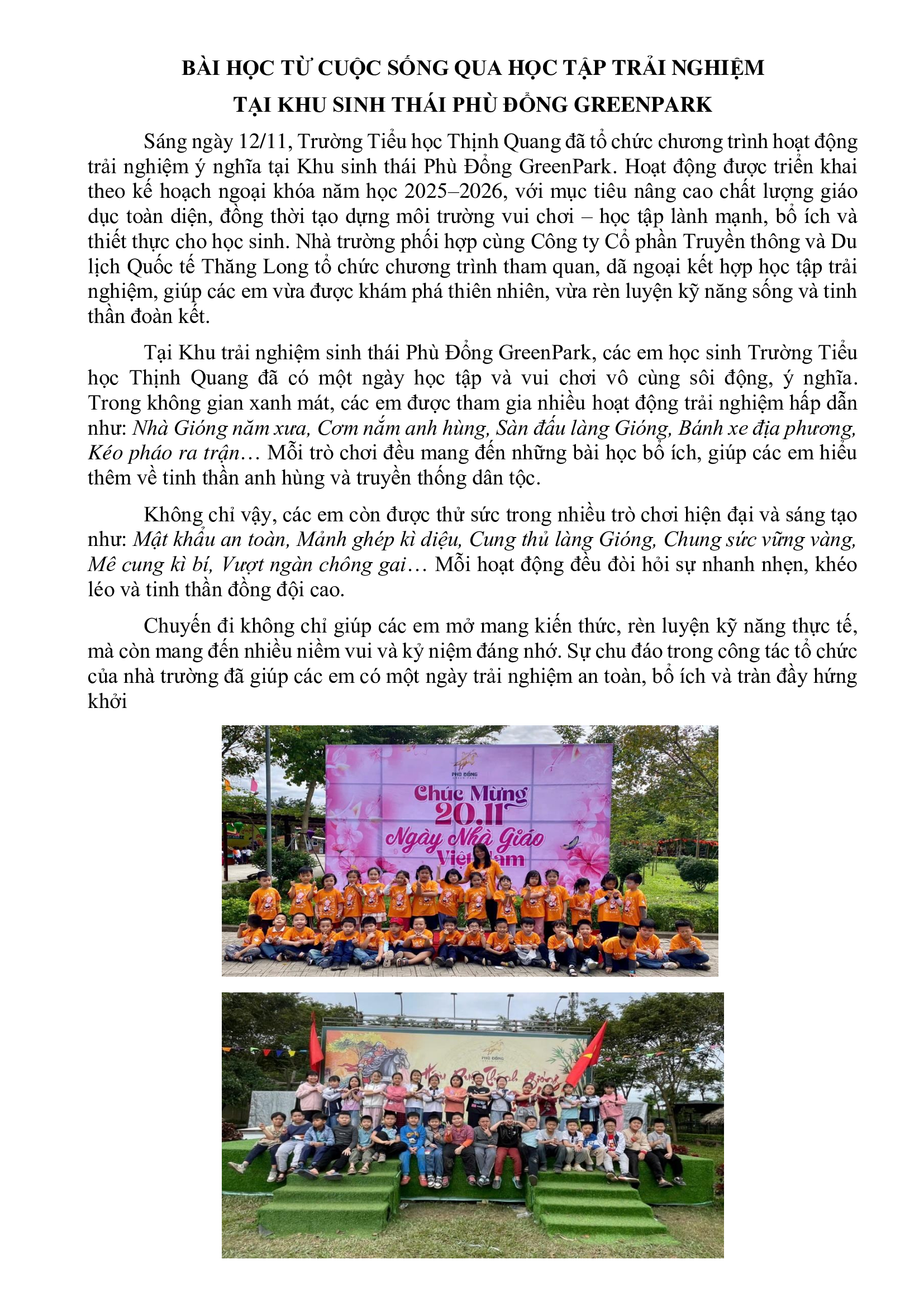 BÀI HỌC TỪ CUỘC SỐNG QUA HỌC TẬP TRẢI NGHIỆM TẠI KHU SINH THÁI PHÙ ĐỔNG GREENPARK