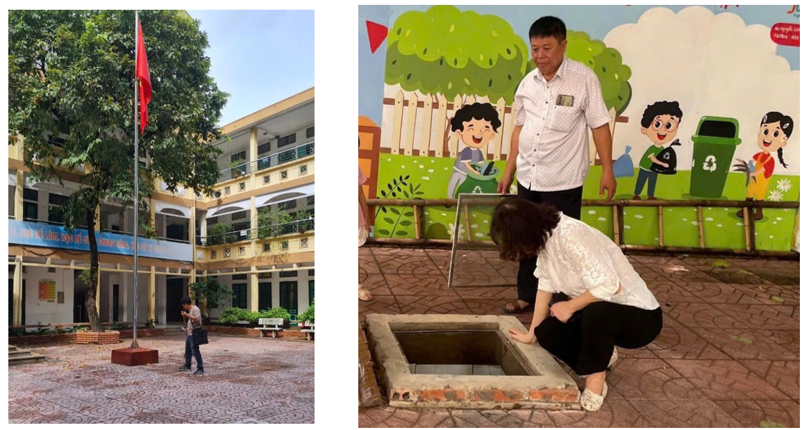 Các bác trong tổ bảo vệ cùng cô giáo Hiệu trưởng đang quét dọn và kiểm tra hệ thống bể nước của nhà trường.