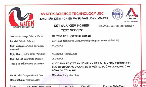 Kết quả xét nghiệm nước sinh hoạt và ăn uống lấy mẫu tại trường Tiểu học Thịnh Quang