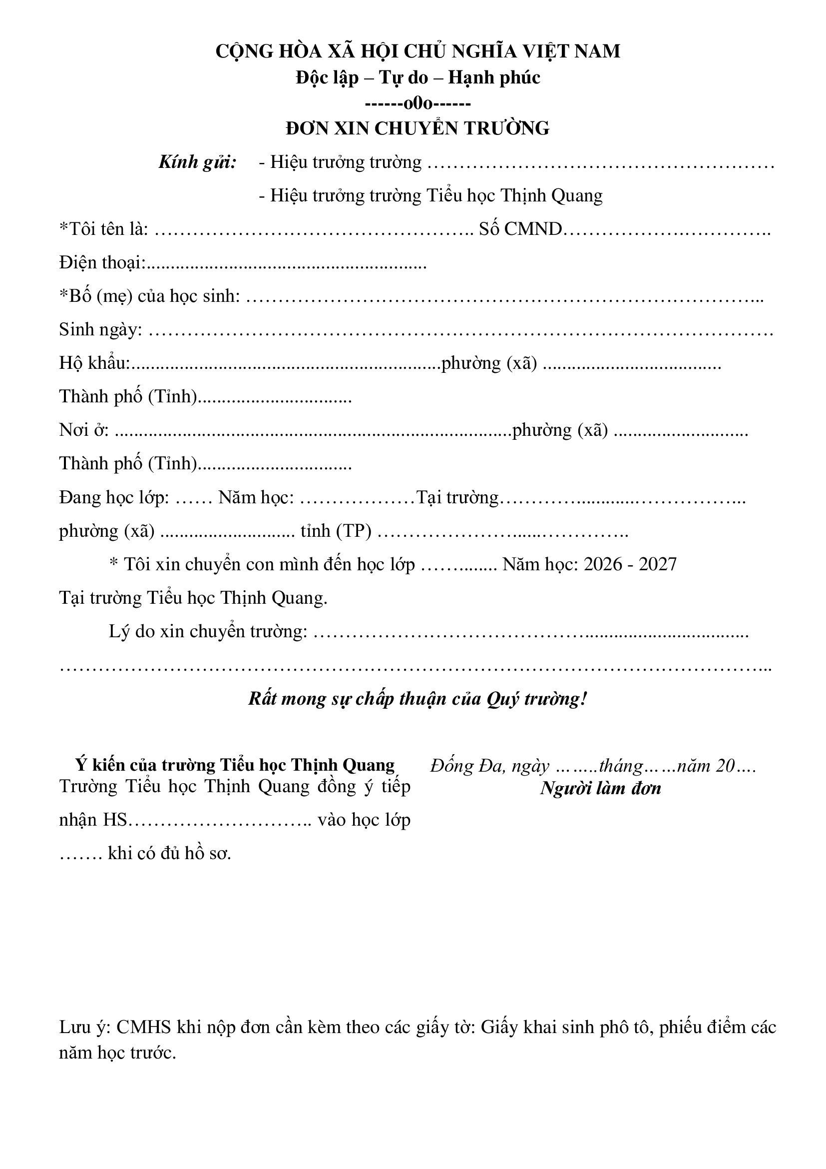Đơn đăng ký xét tuyển vào lớp 1 năm học 2026-2027
