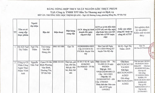 Bảng tổng hợp truy xuất nguồn gốc thực phẩm