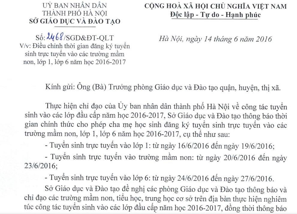 Thực hiện chỉ đạo của ủy ban nhân dân thành phố Hà Nội về công tác tuyển sinh vào các lớp đầu năm 2016 - 2017, Sở giáo dục đào tạo thông báo thời gian chính thức cho phép cha mẹ học sinh đăng ký tuyển sinh trực tuyến.
