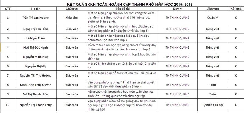 Kết quả skkn toàn ngành cấp thành phố năm học 2015 - 2016