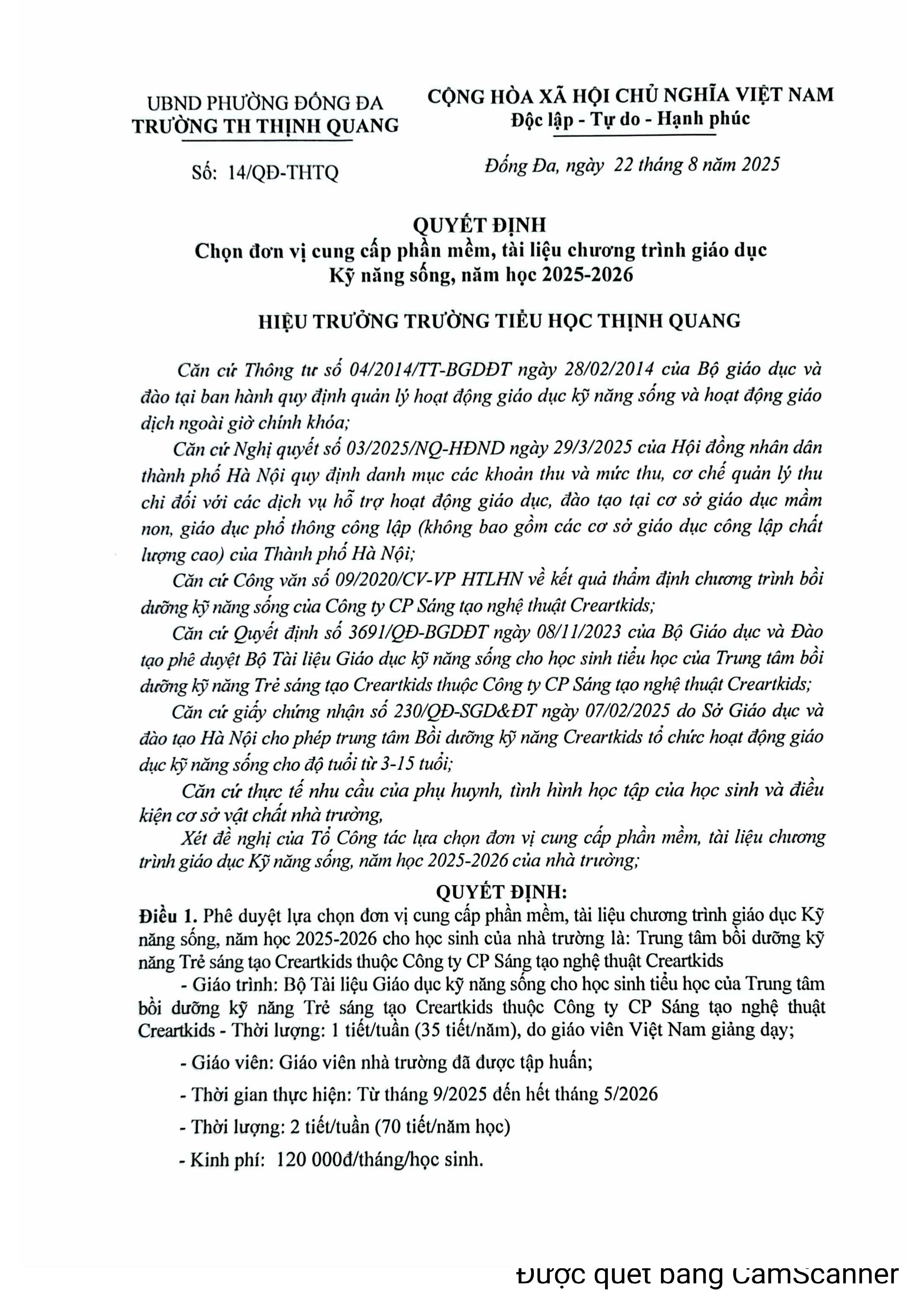 Quyết định chọn đơn vị cung cấp phần mềm, tài liệu chương trình giáo dục Kỹ năng sống, năm học 2025 - 2026
