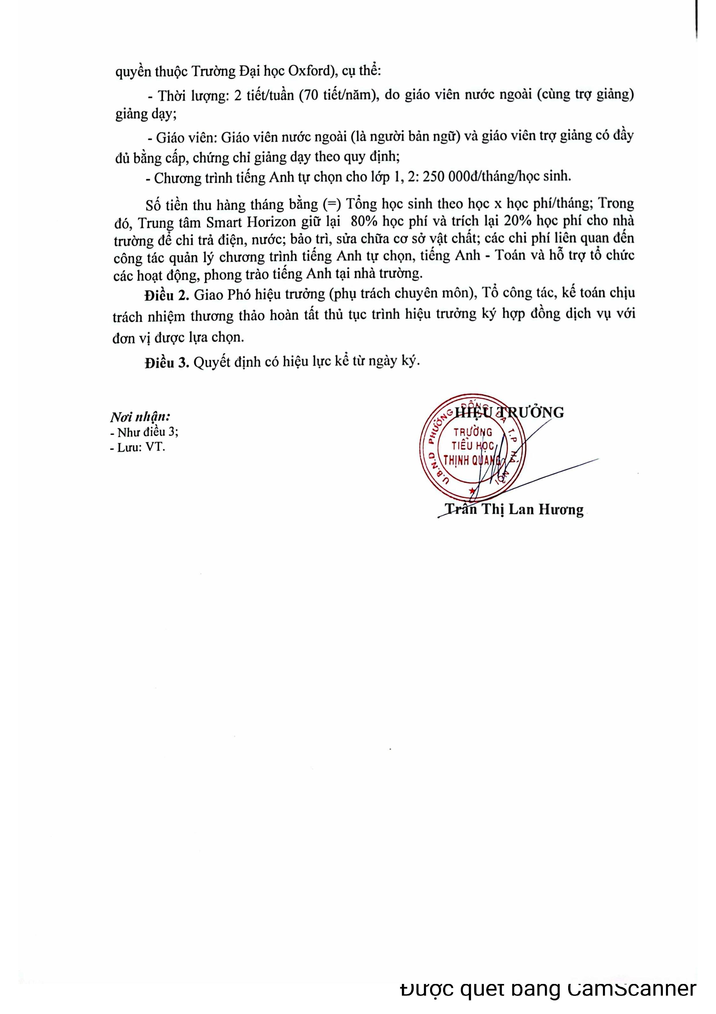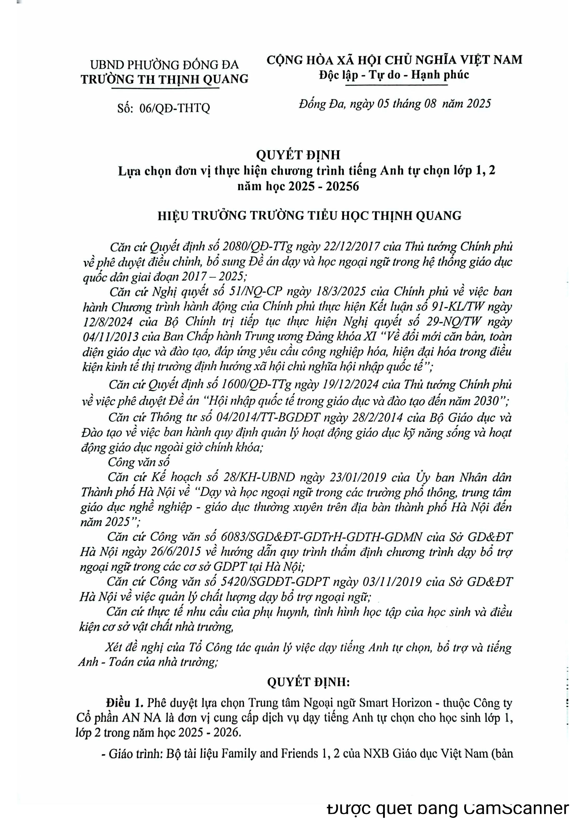 Quyết định lựa chọn đơn vị thực hiện chương trình tiếng Anh tự chọn lớp 1, 2 năm học 2025 - 2026
