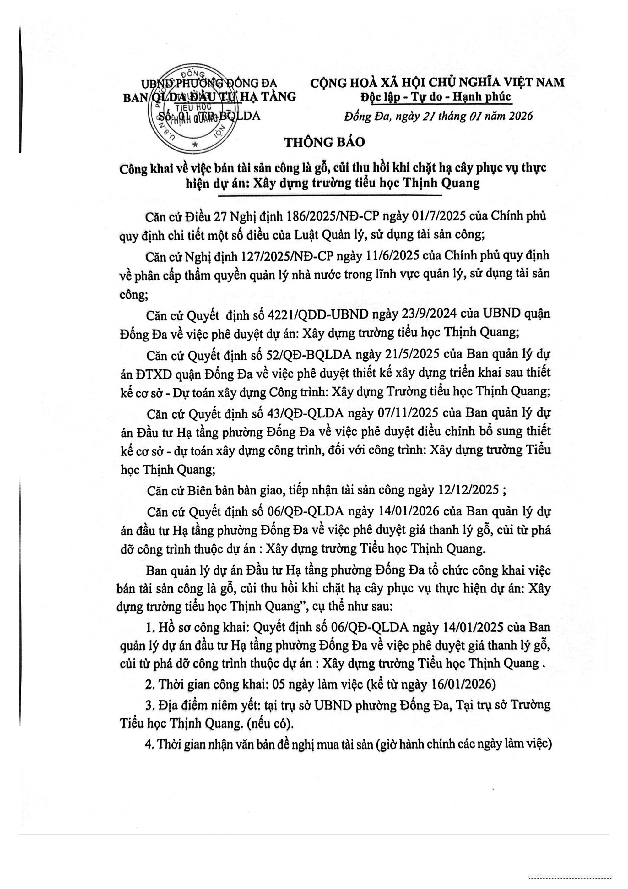 Thông báo công khai vv bán tài sản công là gỗ, củi thu hồi khi chặt hạ cây phục vụ thực hiện dự án: Xây dựng trường tiểu học Thịnh Quang