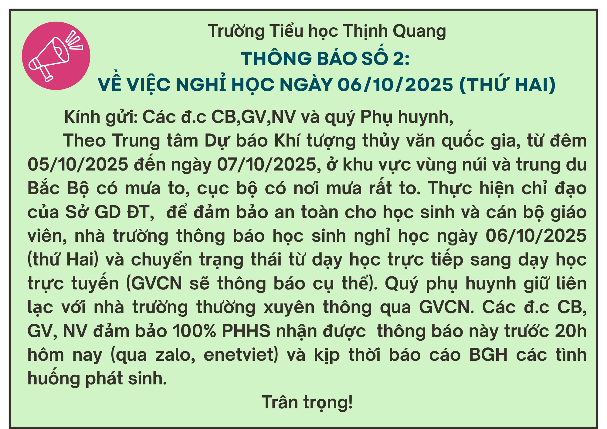 Thông báo số 2: về việc nghỉ học ngày 6/10/2025 (thứ Hai)