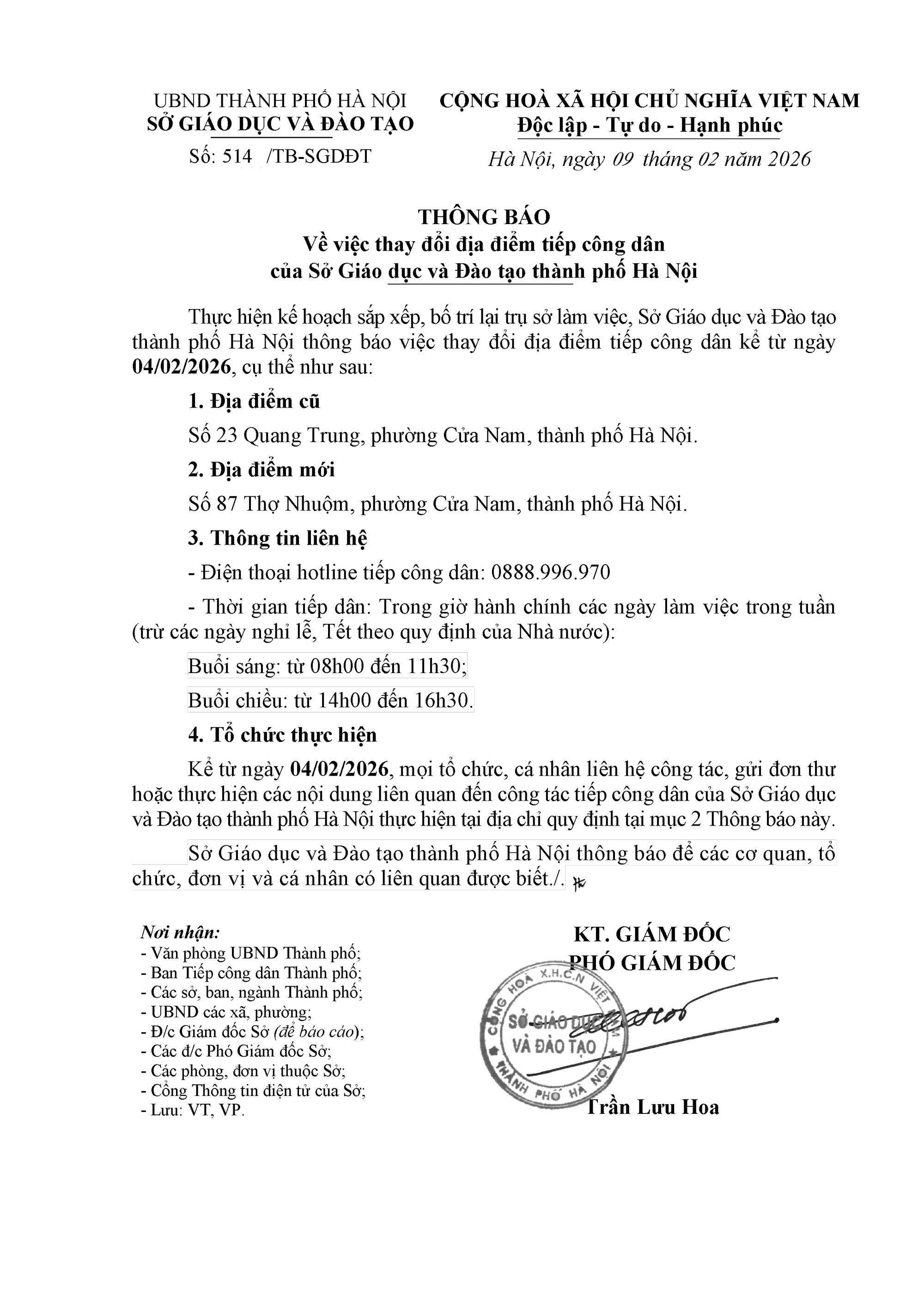 Thông báo vv thay đổi địa điểm tiếp công dân của Sở Giáo dục và Đào tạo thành phố Hà Nội